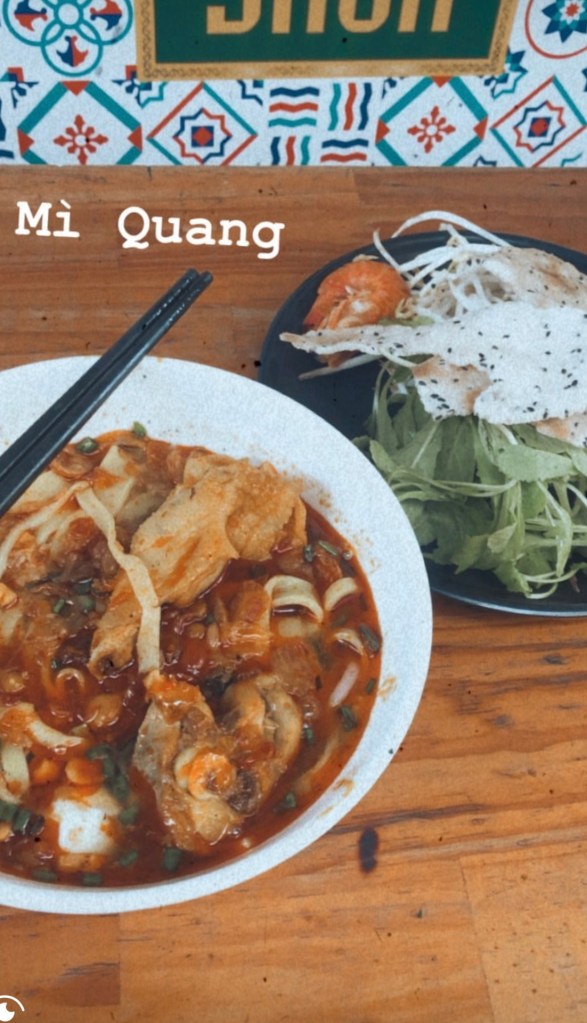 A rice noodle dish, with a source of protein chicken/beef/pork. Sometimes with fish or seafood. Seasoned with turmeric, peanuts, chilli and lime. Served with sesame toast and salad.